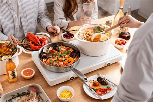 早晨上班前時(shí)間緊湊,準(zhǔn)備一家的早餐常常會手忙腳亂。使用適盒聚嗨爐的左右分區(qū)功能,早餐左邊區(qū)域用來煎雞蛋、培根等,右邊可以放置一口鍋來煮粥;晚餐左邊用來炒菜,右邊用來煮湯,一次性搞定全家早晚飯,省時(shí)又省力。
