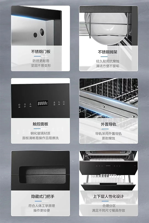 除了上述優(yōu)質(zhì)的存儲、消毒性能之外,老板消毒柜XB710A還擁有多重體貼入微的人性化設計:安全童鎖功能,防止中途誤觸以及寶寶好奇誤觸;觸控面板,易操作易擦洗,便捷省心;隱藏式把手符合人體工學設計;不銹鋼擱架、不銹鋼門板經(jīng)久耐用······
