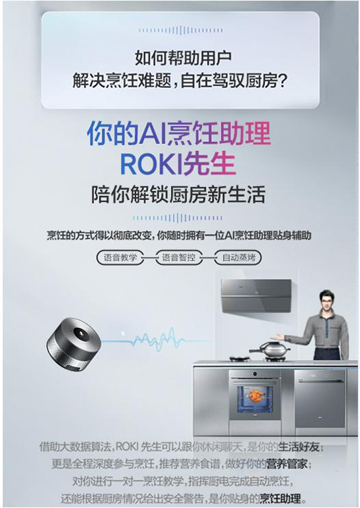 此外,新品CQ920作為ROKI數字廚電中的明星產品,還可配合AI烹飪助理ROKI先生使用。他就像你的生活好友,閑暇時可與他聊天談心,烹飪時化身你的烹飪助理,對你做一對一的指導,指揮廚電完成自動烹飪,并且記錄烹飪中的每一個步驟最終生成一道屬于自己的數字菜譜,將此菜譜分享至他人,他人便能在遠方如實地還原出你飯菜的味道。