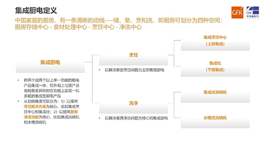 關(guān)于集成廚電,GfK中怡康認(rèn)為是將兩個(gè)或兩個(gè)以上單一功能的廚電產(chǎn)品集成一體、在外觀上與原產(chǎn)品有明顯差異、同時(shí)在功能上實(shí)現(xiàn)一機(jī)多能的集成型廚電產(chǎn)品。現(xiàn)階段集成廚電可劃分為兩大類:以解決家庭烹飪問題為主的烹飪類集成廚電,和以解決廚房餐具清洗問題為核心的洗凈類集成廚電。前者主要包含了以上排集成為特性的集成烹飪中心和以下排集成為特性的集成灶,后者主要以集成式洗碗機(jī)和水槽式洗碗機(jī)為代表。