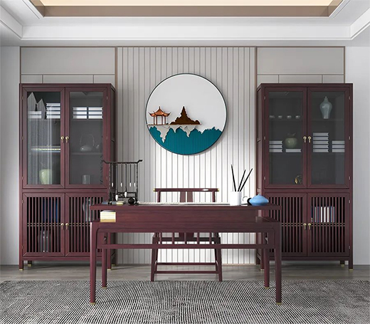 同時(shí)書桌的顏色深淺要注意,可參考書房的硬裝顏色來搭配。若硬裝是淺色系,那么書桌可選擇深色,以加強(qiáng)空間里的層次美感。