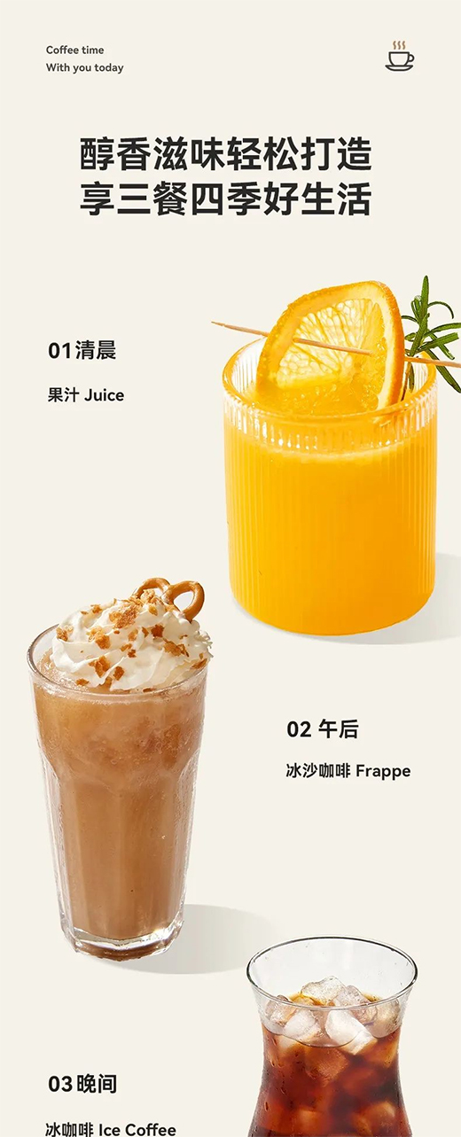 一年365天早中晚,一年四季春夏秋冬,只要你需要它,它都能隨叫隨到。咖啡果汁奶昔輪番來(lái),一日三餐口味不重樣。冷熱溫感隨意調(diào),無(wú)懼嚴(yán)冬與酷暑。所以,咖啡控、果汁控的寶寶們是不是有福啦?