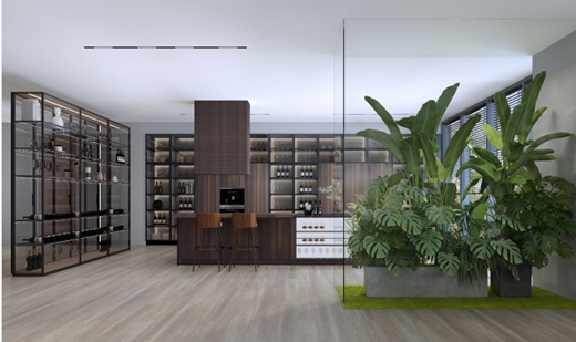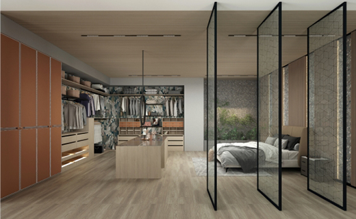 錯落有致的鏤空收納設(shè)計(jì),搭配透光玻璃隔斷,將現(xiàn)代審美與藝術(shù)韻致完美糅合。滿是“綠意”的植物背景墻從地板延伸至天花板,將自然與家相接,衣物猶如置身“垂直森林”,生機(jī)煥發(fā),只為取悅即將盛裝出行的你。
