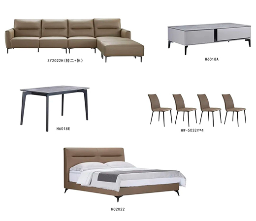 現代系列《幸福里》全屋家具套餐,包含:真皮沙發(轉二件+休位)、茶幾、餐桌、餐椅(4把)、床架、床墊,一共11大件。