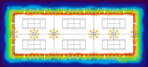 散發式布光方式在原有布燈位置、燈桿高度的有限條件下,七大洲研發人員及設計人員結合現有照明問題,深入探討,根據網球場特性,敲定并選用型號為QDZ-300B、高光效的進口SMD光源燈具。高新科技的芯片優勢明顯,在球場上見光不見芯,光照均勻;照度達國家3級照明標準,滿足專業比賽照明要求,這極大解決了眩光、刺眼、照明昏暗等影響球手對網球運動軌跡判斷的問題,為運動員營造了健康舒適的光環境。