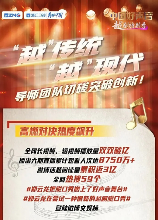 中國文藝評論家協會傅謹文藝點贊道:《中國好聲音》是電視節目中的頂流,越劇是戲曲中最有觀眾緣的劇種之一,兩相疊加,取得了超出預想的效果,短短幾期節目長視頻和短視頻播放量就雙雙過億。 節目切實挖掘并充分展現戲曲本身的意義與價值,顯現戲曲的美感,綻放戲曲的魅力!