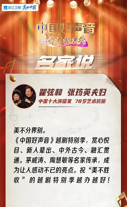 中國十大演播家、78歲藝術伉儷瞿弦和、張筠英夫婦發聲:美不分界別。越劇特別季,賞心悅目、新人輩出、中外古今、融會貫通。《中國好聲音》越劇特別季的熱播也讓更多觀眾欣賞到了越劇的魅力,為弘揚傳統文化立起標桿!